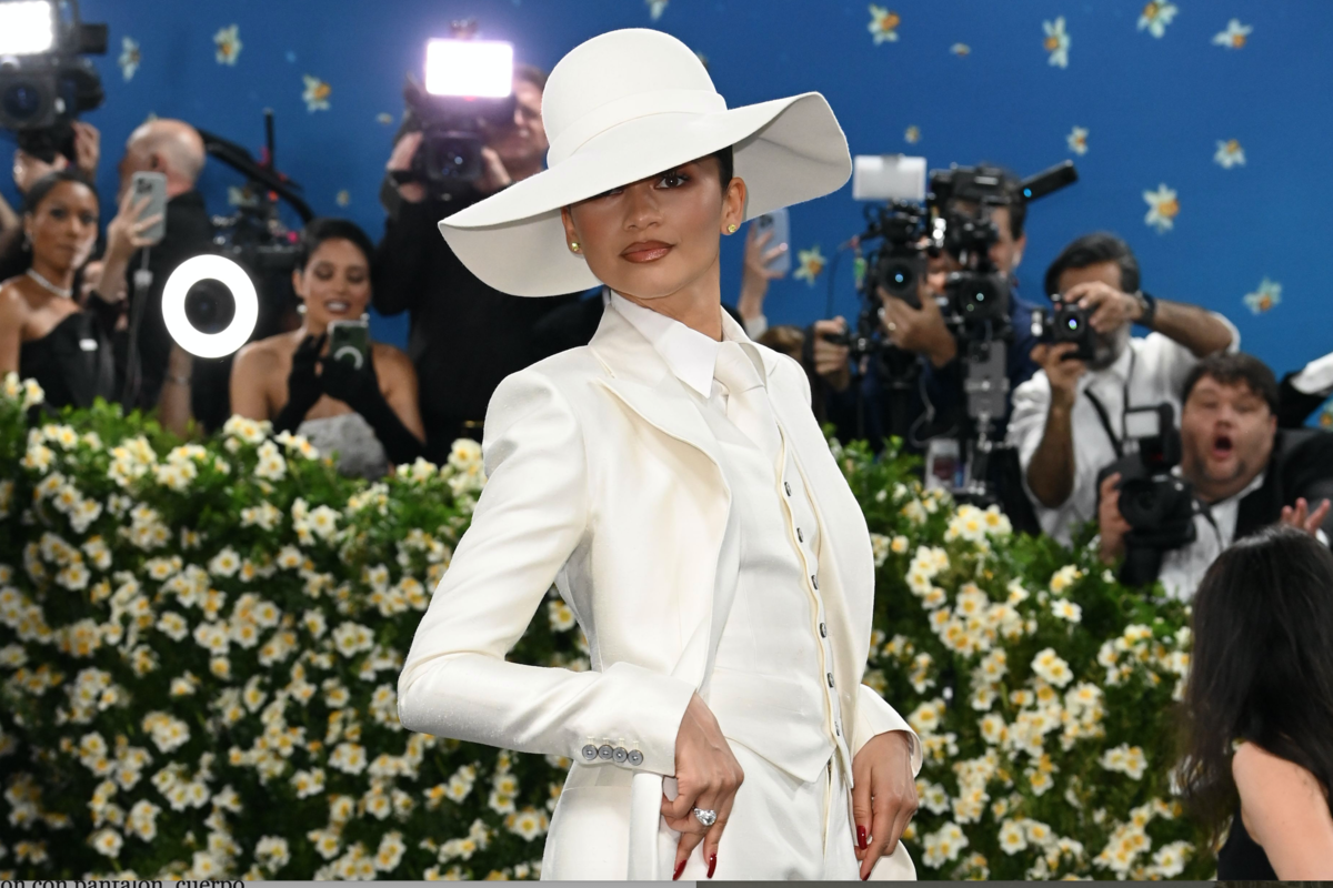 Zendaya una vez más nos ha dejado sin palabras con una elección sobresaliente. Un traje blanco que le queda así de impecable, sencillo y elegante sin más. Un tres piezas compuesto por pantalón acampanado de talle alto, blazer con solapa, chaleco y camisa con corbata, todo en color blanco. El sombrero blanco sin duda ha sido el accesorio perfecto para completar uno de los mejores looks de la noche. Un total look de Louis Vuitton, diseño de Pharrell Williams.