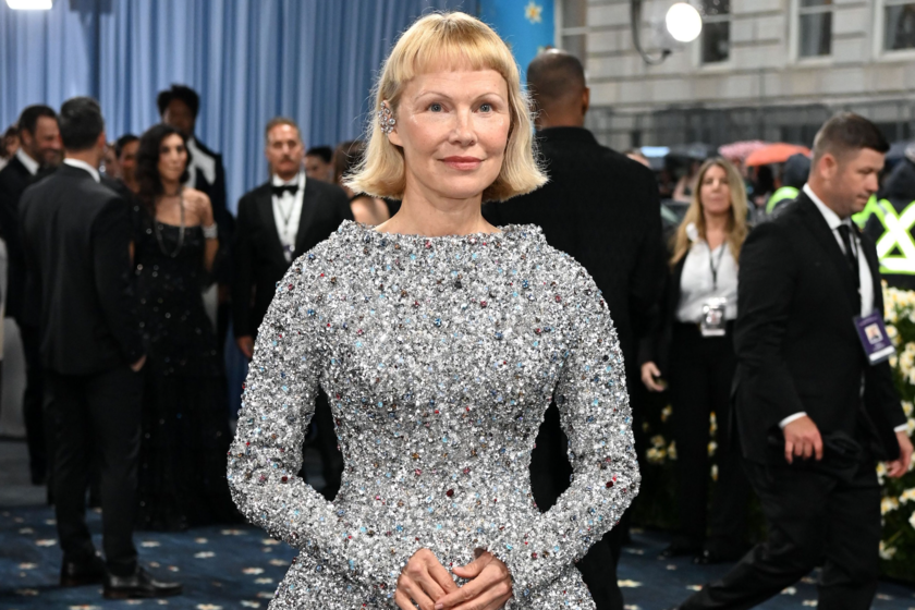 Pamela Anderson se ha decantado por un vestido de pedrería de manga larga y escote redondo, muy soso para una noche tan especial. La actriz ha elegido un vestido de silueta estructurada muy visto, aburrido y poco llamativo. Parece una menina. Y una vez más sin maquillaje, celebrando la belleza natural a partir de los 50.