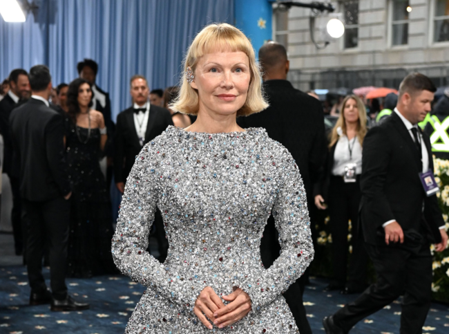 Pamela Anderson se ha decantado por un vestido de pedrería de manga larga y escote redondo, muy soso para una noche tan especial. La actriz ha elegido un vestido de silueta estructurada muy visto, aburrido y poco llamativo. Parece una menina. Y una vez más sin maquillaje, celebrando la belleza natural a partir de los 50.