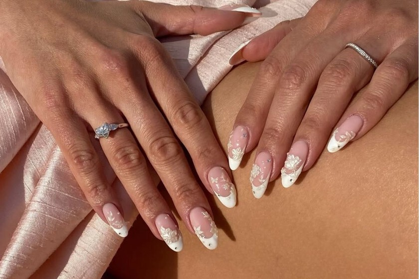 Las flores y la primavera, poco hay que decir. Es el momento de sacar nuestra mejor artillería y crear las manicuras florales más flipantes. Las flores nunca fallan cuando llega el buen tiempo y esta manicura con flores tridimensionales y pedrería sobre una manicura francesa nos encanta.