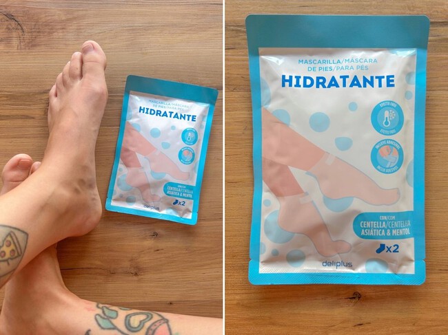 Esta mascarilla hidratante para pies está en la sección de belleza de Deliplus por 2,50 euros. Su ingrediente principal es el extracto de centella asiática, un componente muy utilizado en belleza por su poder hidratante y porque fortalece la barrera cutánea de la piel evitando la pérdida de humedad. También contiene urea, con capacidad humectante y emoliente, que suaviza e hidrata la piel.