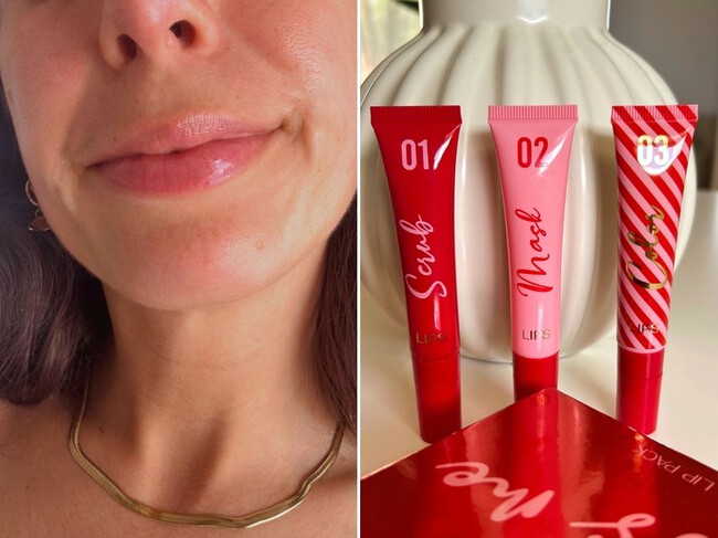 El tratamiento labial Kiss Me viene presentado en una caja de color rojo brillante con tres paquetes individuales en su interior. Cada uno de ellos contiene un paso del tratamiento: exfoliante, mascarilla y brillo con color, numerados para saber lo que viene después. Lo cierto es que entra por los ojos, en colores rojos y rosas que evocan labios sanos, jugosos y rellenos (y un poco navideños, las cosas como son).