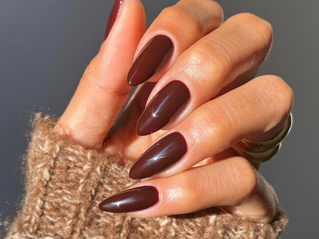 Entre los tonos más intensos y bonitos está el marrón, concretamente el marrón oscuro y acharolado que nos recuerda a las castañas, que lucen un marrón rojizo, liso y brillante. Y claro, las manicuras más distinguidas apuestan por este color de uñas.