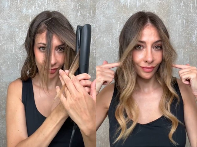 Lo que tenemos que hacer en primer lugar es poner la plancha totalmente en vertical, con el cable hacia abajo (o hacia arriba si os parece mejor). Luego coger mechones pequeños para trabajarlos mejor y solo tenemos que dar un cuarto de giro a la styler y deslizar hacia el lado contrario de la cara.