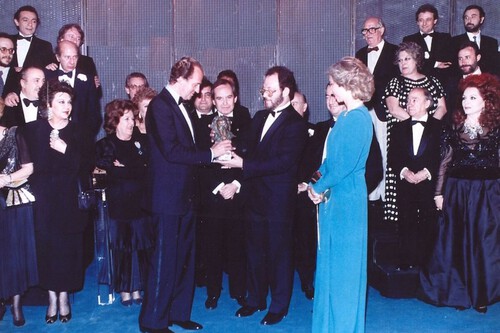 La primera edición arranca con una escena que hoy haría colapsar cualquier retransmisión en directo: el (ahora) emérito y señora saludando uno por uno a todos los nominados. Repito: A TODOS. Sin montaje rápido, sin músiquita de fondo, sin prisa ninguna. Solo apretones de manos eternos y un audio difícil de descifrar que suena como si alguien hubiera dejado el micro dentro de una lata.