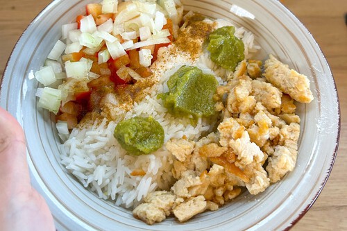 Cuando tengo todo preparado, lo emplato a capas en un plato hondo. Primero la línea de pollo, que compacto usando la cuchara. Después una línea de guacamole y otra de arroz, que queda en el centro. Continuo con una capa de hummus aderezado con comino, para potenciar el sabor. Finalmente añado el "pico de gallo" y un chorrito de aceite de oliva por encima. Ajusto la sal y listo: el pollo y el hummus suman extra de proteína.