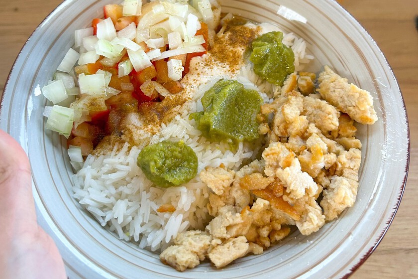 La hora de la cena es durísima para mi. Tengo una jornada laboral completa, un perro con el que pasear y pocas horas para desconectar y descansar, en las que cocinar no forma parte del plan. En esos días que me apetece cero preparar algo elaborado, siempre recurro a mi receta sana y proteica rápida: la he bautizado "arroz arcoíris" por lo colorida que queda.