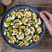 A continuación, lavamos los calabacines, los secamos, cortamos los extremos y lo cortamos en rodajas no demasiado finas. En la misma sartén, sofreímos un diente de ajo pelado en aceite de oliva virgen extra. Cuando empiece a dorarse, incorporamos los calabacines, un poco de sal y unas hojas de menta. Cocinamos durante unos 10 minutos a fuego medio, removiendo de vez en cuando hasta que queden dorados pero tiernos.