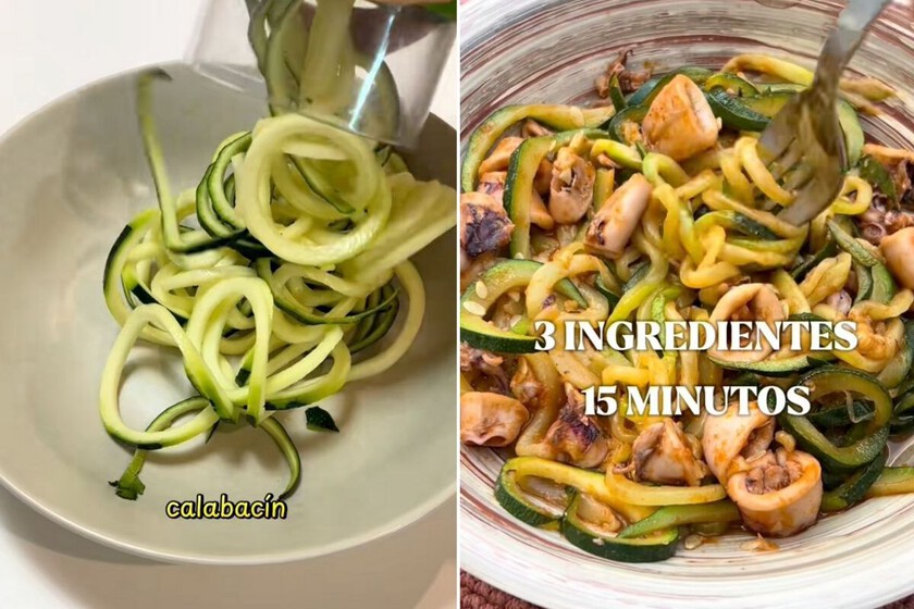En esta ocasión, la proteína se la vamos a dar con unos calamares, que tienen también un alto aporte en minerales como hierro, selenio, yodo, fósforo y calcio, ácidos grasos Omega 3 y vitaminas del grupo B y E y sin sumar apenas calorías ni grasa. Tanto es así, que esta receta nos la recomienda la nutricionista María Malet Viladomiu. Unos espaguetis de calabacín con calamares que tendrás listos en 15 minutos para una cena rapidísima, saludable y muy sencilla.