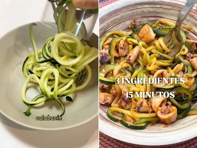 En esta ocasión, la proteína se la vamos a dar con unos calamares, que tienen también un alto aporte en minerales como hierro, selenio, yodo, fósforo y calcio, ácidos grasos Omega 3 y vitaminas del grupo B y E y sin sumar apenas calorías ni grasa. Tanto es así, que esta receta nos la recomienda la nutricionista María Malet Viladomiu. Unos espaguetis de calabacín con calamares que tendrás listos en 15 minutos para una cena rapidísima, saludable y muy sencilla.