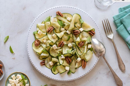 Ahora aliñamos la ensalada de calabacín, feta, nueces y menta y ya tendríamos lista una cena rápida, divertida y deliciosa, perfecta para las noches de verano. Saciante, con una gran cantidad de fibra, grasas saludables y proteínas de calidad, con la que sumamos pocos hidratos pero mucho sabor.