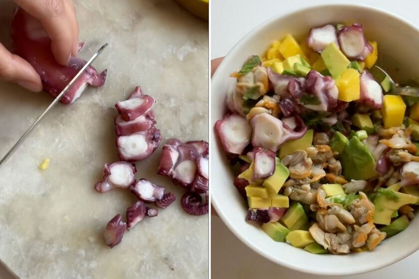 La receta la propone una nutricionista, Rosa Rullán, y es una ensalada fría perfecta para las noches de verano. una receta rápida para la que necesitamos un mango, un aguacate, 2 ó 3 patas de pulpo cocido, una lata de berberechos en conserva, una lima, hierbabuena o menta, pimienta y sal.