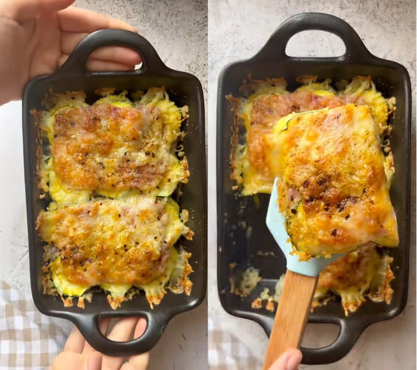 A continuación, rebozamos las láminas de calabacín en polenta, que es una alternativa para empanar más saludable, sin gluten, rica en fibra y carbohidratos complejos, y las colocamos en una bandeja apta para horno. Después, cubrimos con una capa de lonchas de jamón cocido (aunque también podemos sustituirlo por pechuga de pavo) y, por último, agregamos una capa de queso mozzarella rallado.