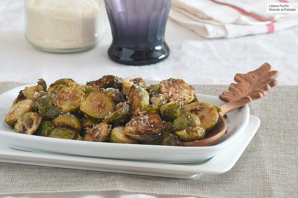 Lavar y secar suavemente las coles Cortarlas por la mitad o en cuartos, si fueran muy grandes. Las más pequeñitas se pueden dejar enteras; la idea es que cada pieza tenga, más o menos, el mismo tamaño. Extender en la bandeja.