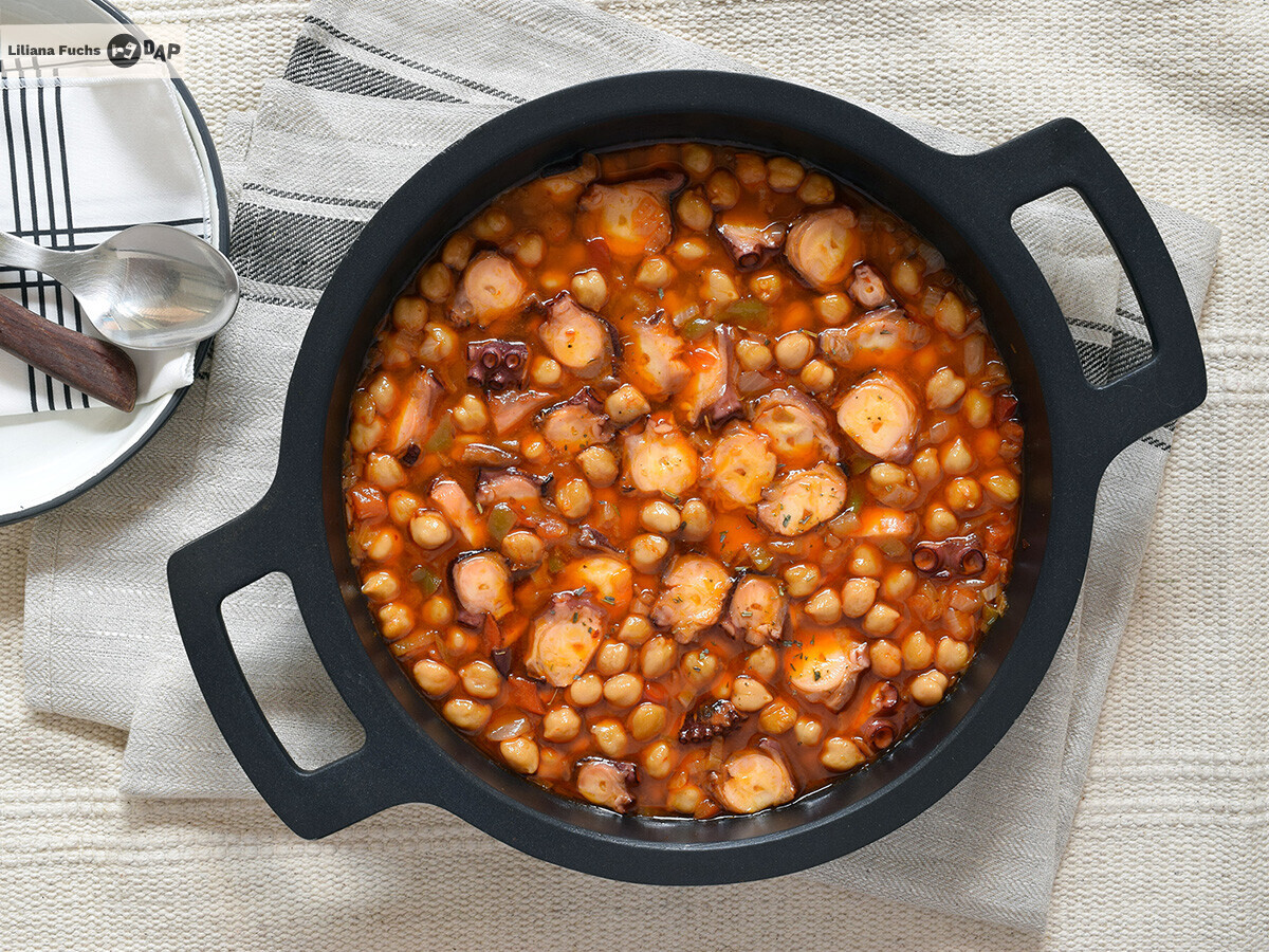 Toca añadir los garbanzos y pulpo que habremos cortado en rodajas finas, y mover un poco. Añade ahora el pimentón (que puede ser dulce, picante o ambos), remueve y acto seguido, echa el vino y deja que se evapore el alcohol antes de añadirle agua o caldo de verduras o pescado hasta que los garbanzos queden cubiertos. Dejamos que cueza a fuego bajo unos 15 o 20 minutos y rectificamos de sal. Con eso ya tendríamos el guiso listo.