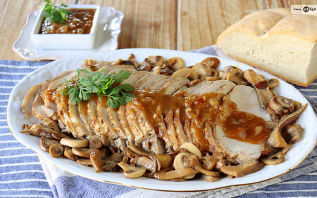 Cuando la carne esté lista, solo tenemos que romper su cofre de sal, y filetear el lomo en lonchas muy finas. No te olvides de las guarniciones, como unos champiñones salteados o una sencillas patatas que para darles más empaque, podemos hacer en versión Cambray. Ricas, crujientes y facilísimas.