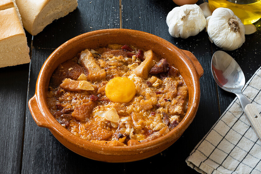 Para dos personas necesitarías unos 150 gramos de pan de hogaza del día anterior, cuatro dientes de ajo, una cucharada de pimentón dulce, tres huevos y aceite de oliva. Como te decía, yo le añado unos tacos de jamón, pero puedes omitirlos si quieres una receta vegetariana. Necesitaríamos además agua o caldo. Si usamos caldo puede ser de pollo o de verduras, pero podrías usar agua. El resultado es algo menos sabroso pero igualmente bueno.