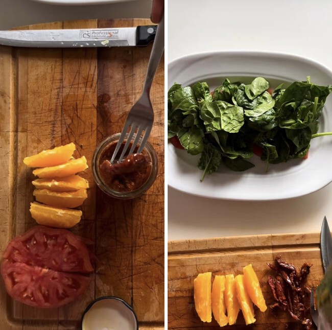 Empezamos cortando media naranja en trozos pequeños, así como la mitad de un tomate. Cogemos un par de trozos de tomate semiseco y también los partimos. Colocamos todos los ingredientes en un bol y añadimos media bolsa de espinacas. A continuación, cortamos unas tiras de jamón como toque final junto con una burrata para darle cremosidad a nuestra ensalada otoñal.