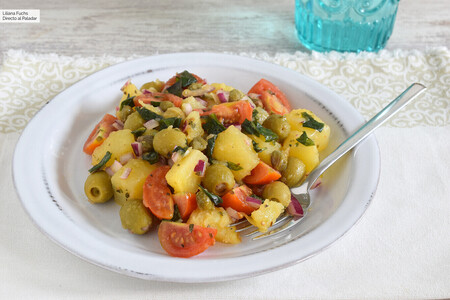 Lo cierto es que una ensalada con patata siempre es más saciante que una ensalada que hacemos con verduras frescas o de hoja, y por supuesto siempre lo es más que las sopas frías típicas del verano como el salmorejo o el gazpacho. Si queremos que esta ensalada sea una cena completa necesitaríamos algo de proteínas, como por ejemplo un poco de queso de cabra o feta, que le va muy bien a esta ensalada si reducimos la sal del aliño, o podemos añadir un huevo cocido o atún al natural.