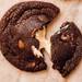 Ponemos papel vegetal en una bandeja de horno y con ayuda de una cuchara hacemos una bolita con la masa. Cogemos una onza de chocolate blanco (que sea de buena calidad) y la colocamos en el centro de la galleta. Presionamos hacia abajo suavemente y tapamos con otra pequeña porción de masa que sacamos del bol. Una vez bien cerrada, volvemos a formar la bolita con las manos y la dejamos sobre la bandeja.