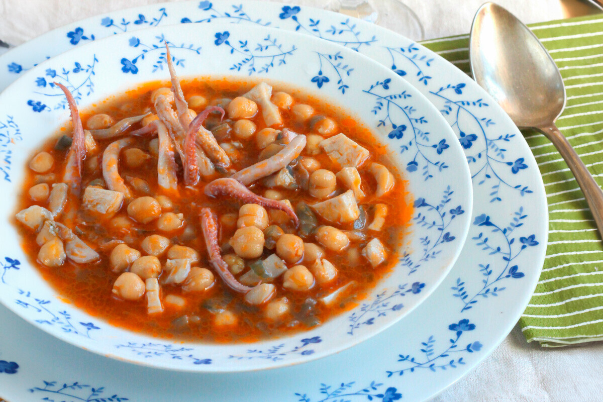 Cuando el sofrito está listo, añadimos el calamar troceado y dejamos que se cocine todo junto durante 5 ó 6 minutos. Mientras, vamos a lavar muy bien los garbanzos y a escurrirlos. Cuando hayan pasado esos cinco minutos, metemos los garbanzos y cubrimos con el caldo de pescado o con agua. Dejaremos que cueza unos diez minutos y añadimos sal al gusto.