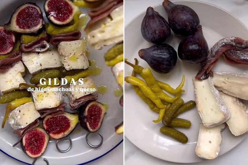 En primer lugar, cambiamos los palillos de madera por pinchos de brocheta, porque esta gilda no solo es elegante, también es enorme. A continuación, comenzamos a clavar los ingredientes: medio higo, una anchoa, un trozo de queso brie, media piparra (si no te gusta el picante, sáltate este paso). Continua con un pepinillo en vinagre, otro trozo de queso brie, otra anchoa, la otra mitad de la piparra y medio higo.