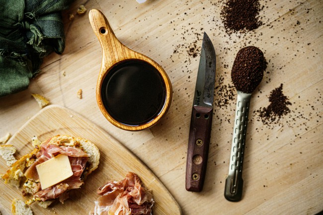 Para potenciar el sabor del jamón, propone echarle un poco de ralladura de piel de naranja al café solo y embadurnar la rebanada de pan con esta insólita mezcla, tal y como habríamos hecho con el aceite o con mantequilla. Después, tostamos el pan y por último le ponemos el jamón ibérico encima.
