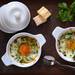 Repartimos la mezcla en las cazuelitas ndividuales y horneamos unos 10 minutos. Después, tapamos las cazuelas y dejamos hornear otros 8-10 minutos más. Transcurrido este tiempo, hacemos un hueco en el centro y cascamos un huevo dentro de cada cazuela. Por último, salpimentamos un poco y volvemos a meter al horno.