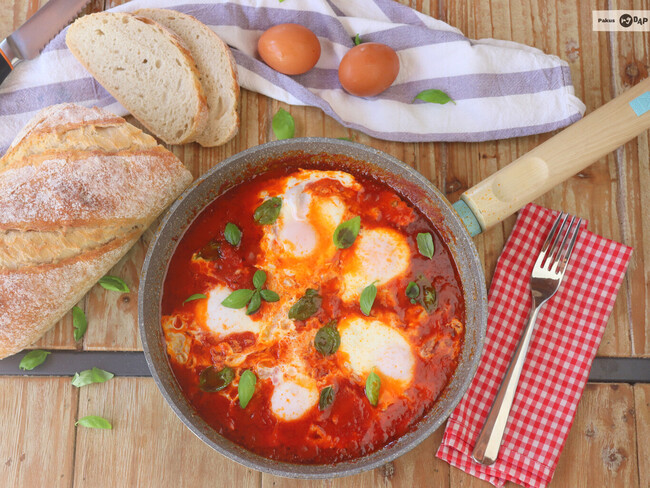 Cuando esté todo, tapamos la cazuela o sartén y dejamos que los huevos se escalfen en la salsa de tomate hasta que la clara esté cuajada y la yema cremosa. Con apenas dos minutos lo tendrás más que listo. Ahora solo tienes que añadir unas hojas de albahaca y agenciarte un buen trozo de pan porque esta cena, es para mojar con ganas.