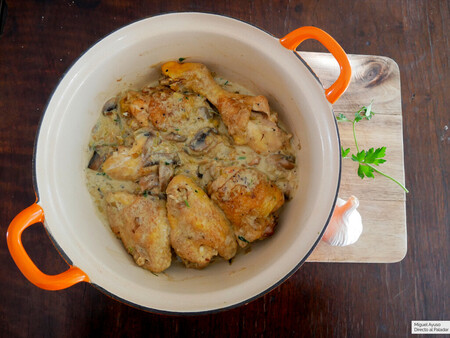 Este pollo con una salsa de nata, vino, ajo, champiñones y puerros, es sencillamente impresionante: una explosión de sabor que nadie debería perderse.