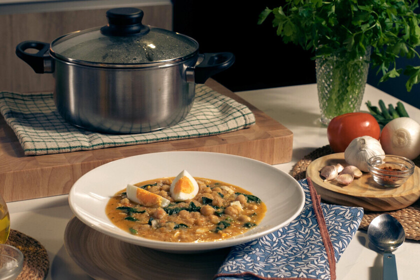 En casa de mis padres, cuando se acerca la Semana Santa, hay un plato de cuchara que se repite casi semanalmente: el potaje. Ese clásico guiso de cuaresma es diferente según la región. En Murcia, por ejemplo, se prepara con espinacas o acelgas y en Cádiz, con tagarninas. El clásico es un guiso lento y con calma, de los que hacen chup chup poco a poco y que saben mejor de un día para otro, pero tenemos tiempo para poco hoy en día, y las versiones exprés de guisos tradicionales están ganando la batalla. Esta versión de Directo al Paladar de potaje con garbanzos de bote se hace en menos de media hora, pero está buenísimo.