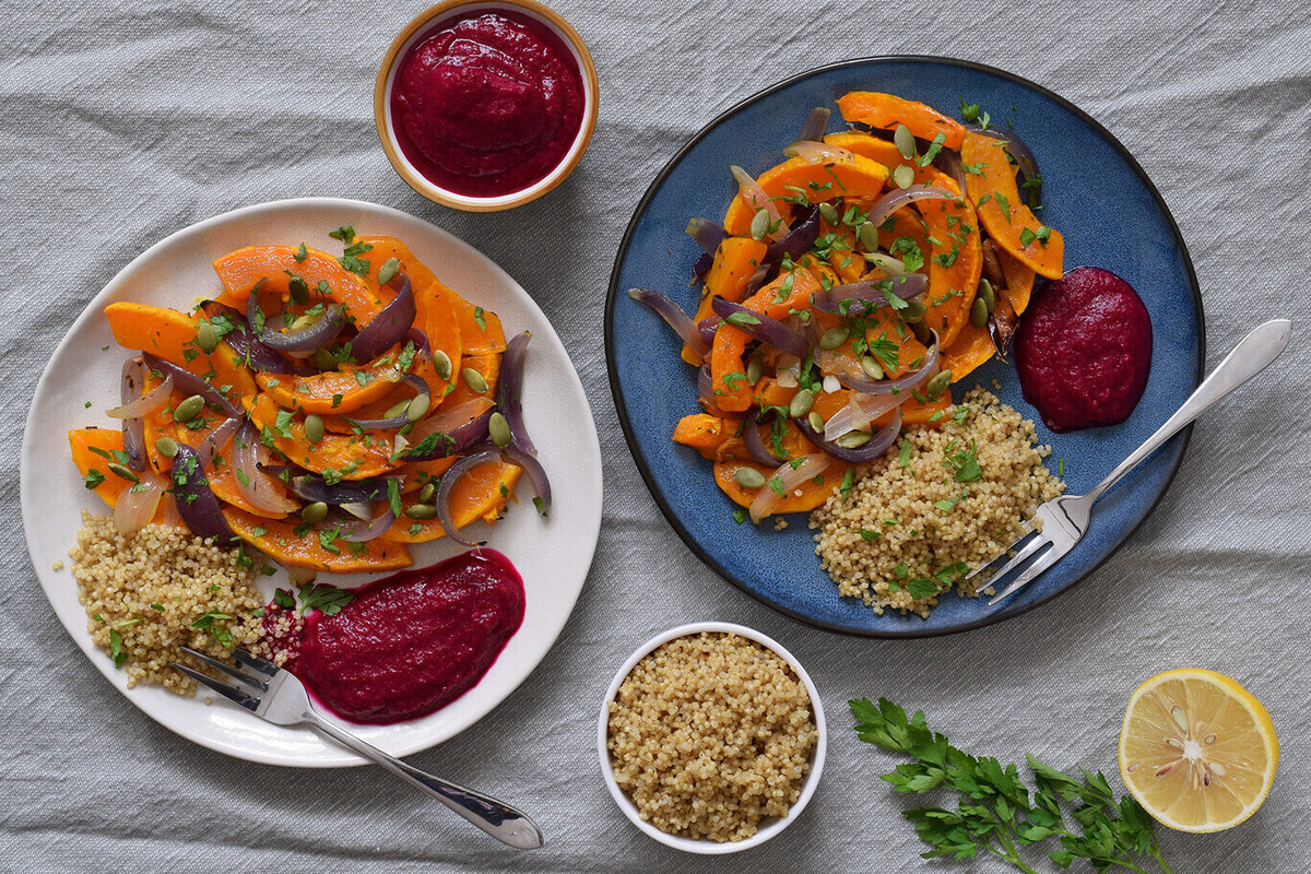 Cómo preparar calabaza asada con cebolla y salsa de remolacha