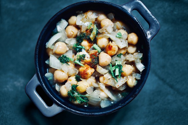 Con esta receta, Joseba Arguiñano demuestra que es digno heredero del legado culinario de su famoso padre. Se trata de un plato en el que se hace patente que la sencillez también puede tener mucho sabor. El secreto está en el ajo y la cebolla en polvo, dos ingredientes humildes pero que son la clave de toda la intensidad de la preparación. Además, sin robarle frescura. Berenjenas asadas lentamente, garbanzos y un sofrito sencillo se combinan en una propuesta tan saludable como reconfortante. Una cena fácil, con alma casera pero con sello de chef.