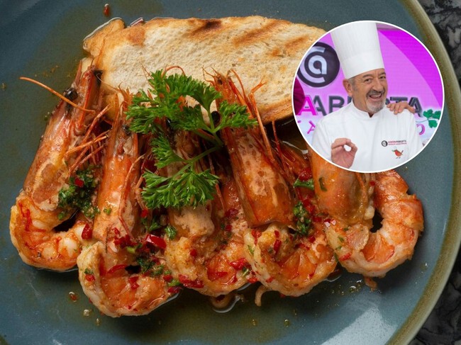 Lo que propone el chef vasco y comparte en sus redes sociales es darle una vuelta de tuerca a unos gambones al horno para que la presentación sea más elegante, pelando los gambones pero manteniendo su colita y la cabeza, quitando la cáscara solo del lomo con un poco de paciencia. Las cáscaras no las tires, pueden servirte para hacer un fumet de marisco.