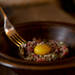 Cuando el aliño está listo, lo mezclamos con el fuet y emplatamos usando un aro de metal para que tenga mejor aspecto, y si quieres, añade una yema por encima que te recomiendo curar en salsa de soja. Le aportará un toque diferente. Para hacerla solo tienes que separar una clara de la yema y guardar la segunda en un bote con salsa de soja que la cubra bien. Lo meteremos en la nevera y dejaremos un par de horas. Cuantas más horas las dejes, más curadas y cremosas estarán. De hecho si las dejas 12 horas, puedes usarlas para untar en pan porque quedan con la textura de una mantequilla, pero en este caso solo queremos que no vaya la yema en crudo así que con un par de horas es suficiente.