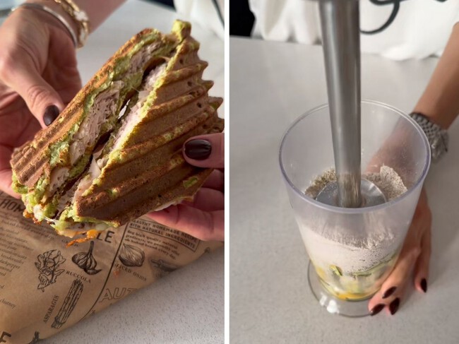 Para hacer el pan solo tenemos que batir todos los ingredientes con una batidora de mano y extender la mezcla en una sandwichera o en una sartén ligeramente untada con aceite de oliva. Cuando la masa esté cocinada por ambos lados, rellenamos como más nos guste y si quieres, puedes rematarlo con un par de minutos más en la sartén para que el relleno también esté caliente.