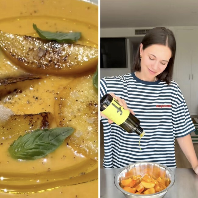 Cogemos las rodajas de melocotón que habíamos dejado en un plato a parte y a fuego fuerte y con un chorrito de AOVE las pasamos por la sartén. Emplatamos la sopa fría y colocamos sobre ella las rodajas de melocotón. Añadimos de nuevo un chorrito de aceite de oliva virgen extra y ya estaría nuestra receta estrella del verano. Súper fresquita y lista para disfrutar.