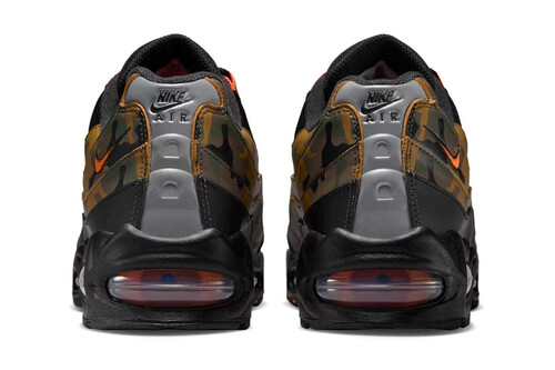 Esta nueva versión de las Air Max 95 Green Camo combinan capas con distintos materiales (piel, ante y mesh), siguiendo ese guiño a la anatomía humana que hizo famosas a estas zapatillas desde sus orígenes. En esta versión, las capas en tonos verdes crean un camuflaje militar en la base de los paneles ondulados, mientras que el resto fluye en negro sobrio para compensar la estética.