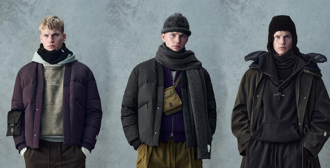 En esta colección, destacan los cortes holgados de las prendas de exterior, sobre todo las chaquetas acolchadas con silueta boxy y las clásicas bomber, llevándolas al extremo de una gama cromática que va desde tonos crudos hasta el negro y el púrpura profundo, con los que podemos crear combinaciones de colores clave, como el marrón y el verde musgo de otras piezas como pantalones cargo o zapatillas deportivas.