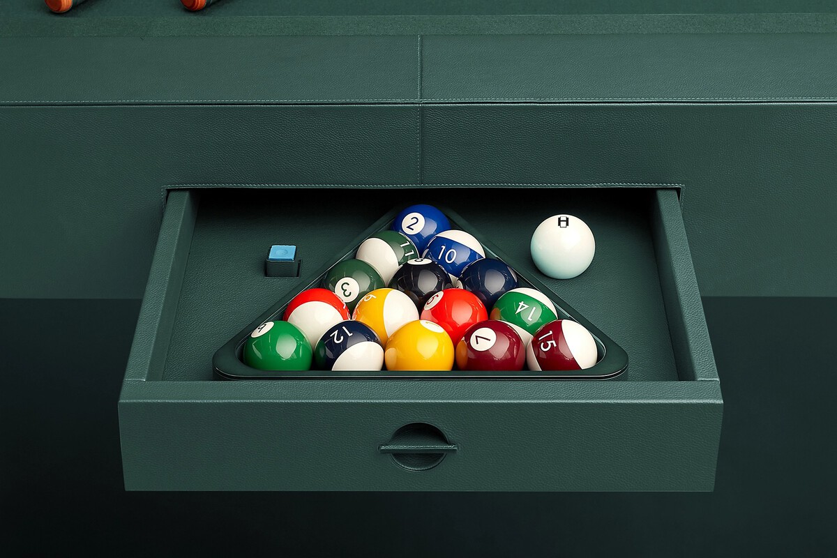 Hermès ha respetado la esencia clásica de la forma de una mesa de billar, pero la ha revestido de una piel mate combinada con madera lacada de líneas curvas que le da un aire elegante y atemporal a la vez, un poco como si un coche clásico reinterpretado por un diseñador de alta costura se hubiera convertido en mobiliario de casa.