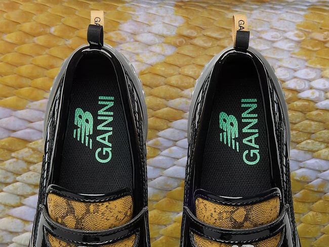 Para esta colaboración, Ganni aporta su sello característico con una estética atrevida. En su versión del 1906L incorpora estampado tipo serpiente, superposiciones satinadas, detalles metálicos y una correa reinterpretada con los emblemas de Ganni: la mariposa de metal y la placa de New Balance en metal.