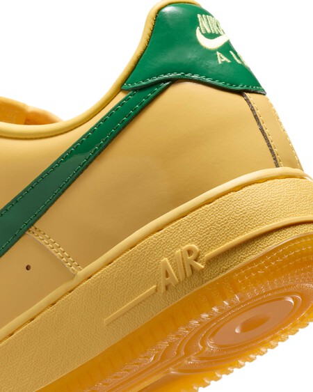 Hay algo especialmente llamativo en cómo estas Air Force 1 juegan con la luz: el acabado brillante potencia el tono dorado suave, haciendo que cambie según el look, además, el detalle del swoosh en tono verde las convierte en una pieza muy fotogénica que definitivamente llama la atención.