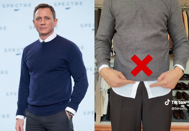 Otro de los puntos a tomar en cuenta al combinar estas piezas, es que el bajo de la camisa no sobresalga demasiado del jersey, porque te puede dar un aspecto desenfadado que desentona con el ambiente de la oficina. Para solucionarlo, basta con abotonar de forma invertida los últimos dos botones de la camisa: el botón de abajo con el ojal de arriba y viceversa, así el bajo de la camisa no quedará demasiado largo y lucirá mucho más formal.