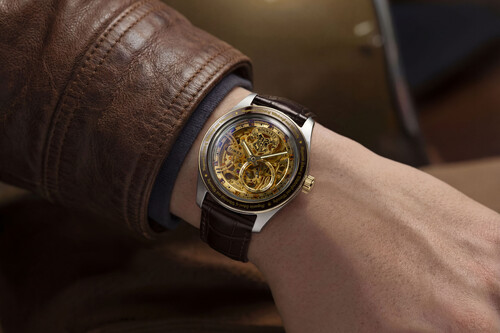 La propuesta de diseño se completa con una correa de piel marrón con textura de cocodrilo, pensada para acompañar tanto un traje relajado como un conjunto más casual de inspiración sartorial. El fondo transparente revela el mecanismo interno junto a los emblemas de las cuatro casas, cerrando el círculo entre artesanía y narrativa.