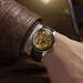 La esfera esqueletizada deja al descubierto un movimiento automático de 21 rubíes, convirtiendo cada vistazo en una experiencia visual donde la mecánica se vuelve protagonista, mientras los cristales facetados en tono marrón aportan una elegancia discreta.