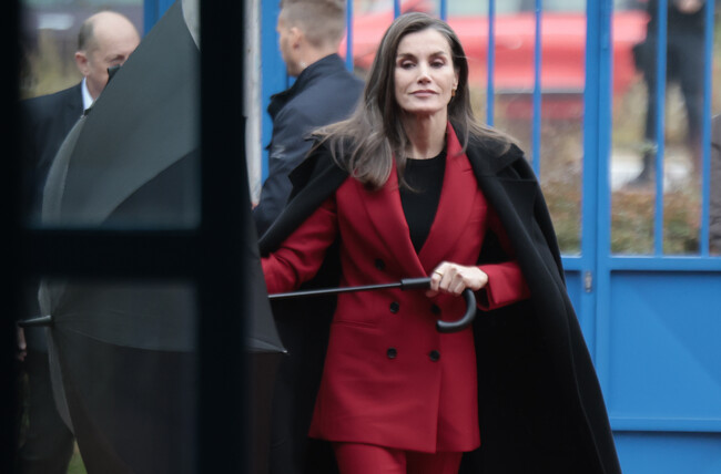 Para la ocasión, la reina se ha decantado por un sastre rojo-granate, el tono de tendencia, tan favorecedor y elegante. Un dos piezas compuesto por blazer cruzada con botones negros y pantalón recto firmado por Hugo Boss, que ya ha lucido en más ocasiones.