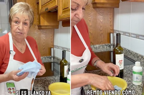 En el caso de que tengas una mancha de vino en una prenda blanca, Conchita recomienda usar percarbonato de sodio, un producto de limpieza que podemos encontrar en supermercados como Mercadona y que se descompone en bicarbonato de sodio y agua oxigenada. Lo que hace Conchita es colocar la mancha dentro de un bol (no hace falta que coloques toda la prenda dentro), y la cubre con el percarbonato.