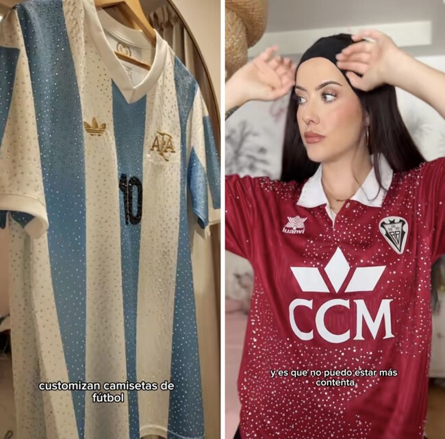 El paso a paso para sumarte a la moda del momento es contar con una camiseta de fútbol. Nosotras nos decantamos por una versión más oversize. No hace falta ser una fan de este deporte para sumarte a este trend. Solo necesitas unas hojas con brillantes y un poco de imaginación. Nosotras hemos seguido los pasos de la TikToker Raquel Rodríguez.