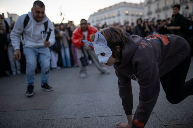 Escenas similares se repitieron en otras ciudades. En la Puerta del Sol de Madrid, un pequeño grupo de jóvenes caracterizados como animales fue rodeado por cientos de curiosos que grababan y se burlaban. En Málaga, un joven con máscara de caballo terminó huyendo tras ser rodeado por una multitud y toreado por otro asistente con una bandera de España.
