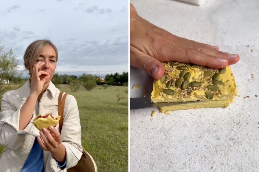 Monreal explica que lo puedes hacer en el horno (a 180º durante unos 25 minutos), o en la freidora de aire (unos 12 minutos a 180º), pero en el microondas queda muy bien y lo tenemos listo en un periquete. Solo tienes que desmoldar cuando esté cocido y dejar que enfríe un poco antes de cortarlo. Luego lo puedes rellenar de lo que más te guste como harías con cualquier otro sándwich. La cocinera lo rellena con tomate, pavo y rúcula, pero puedes usar cualquier otra cosa, desde verduras a la parrilla con paté de aceitunas para marcarte un sándwich vegano para cenar hasta un relleno de mortadela y queso San Simón para un día especial.